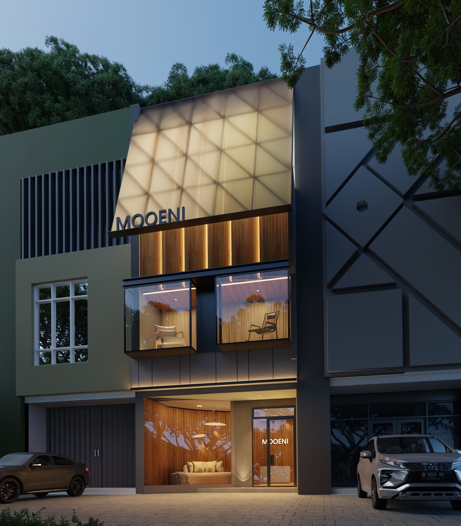 MOOENI stands as a modern architectural statement in Jakarta. Its facade highlights a luminous translucent panel and striking display windows, creating a dynamic visual volume. The blend of dark materials and warm wood accents, cleverly illuminated, forms a bold and characterful composition. The store itself is a captivating architectural object.